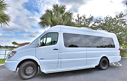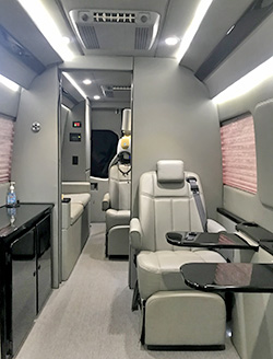 The interior is outfitted with luxury leather power reclining seats, limousine black tinted windows for ultimate privacy, two flat screen TVs with headsets for private listening, and several AC units for perfect climate control. There is a sitting area for guests or loved ones, and an additional private room for work. The van is equipped with many power outlets and Wifi internet, so that work can be done on-board, if necessary.